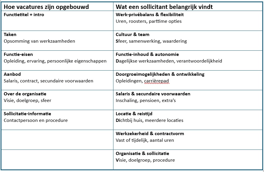 Samengevat: waar vacatures vooral informatie ‘zenden’, zoeken sollicitanten herkenning, vertrouwen en praktische informatie.